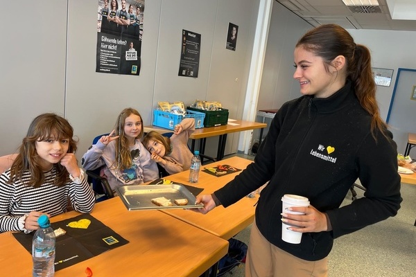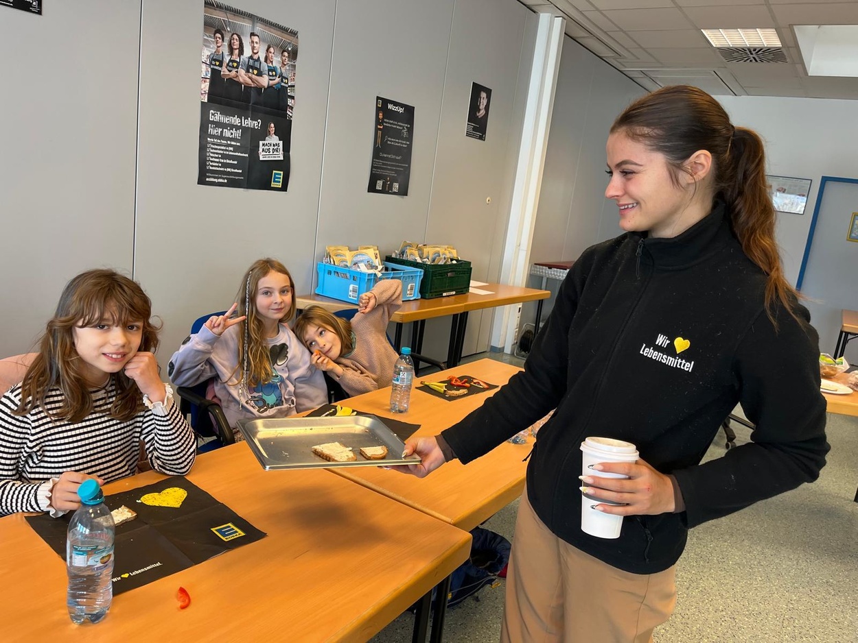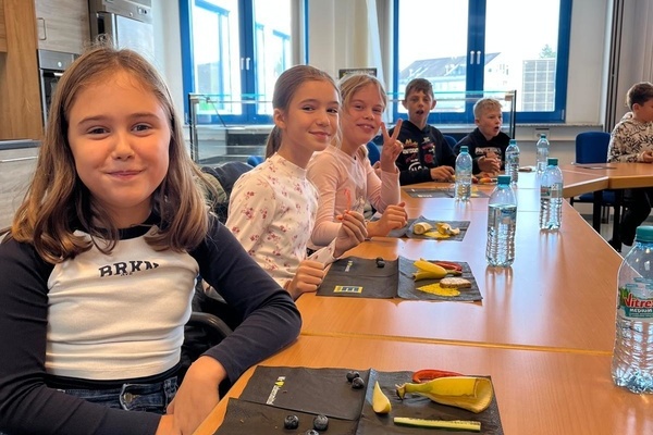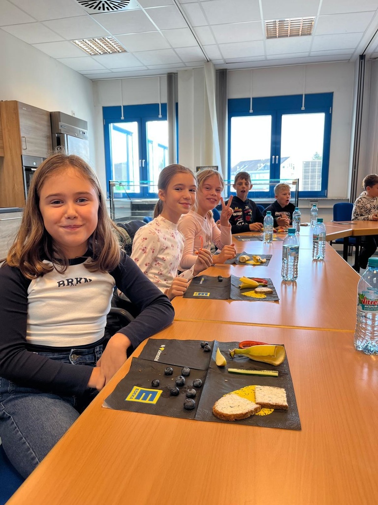 In Gundelfingen angekommen blieb noch Zeit für eine kurze Runde auf dem Spielplatz, dann ging es zum E-Center, bei dem wir gleich herzlich empfangen wurden. Nach einem spannenden Theorieteil zum Thema "Gesunde Ernährung" gab es ein super leckeres, abwechslungsreiches, gesundes Frühstück. Im Anschluss daran machten wir eine Führung durch den E-Center, bei der uns auch das Lager und die Papierpresse gezeigt wurden, außerdem konnten wir an Gewürzen riechen und raten, was es für welche waren sowie Kräuter probieren und in einer Fühlkiste Obst und Gemüse erfühlen.