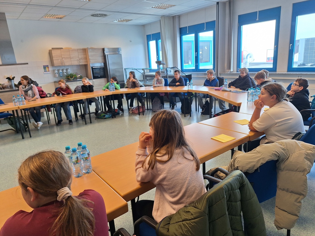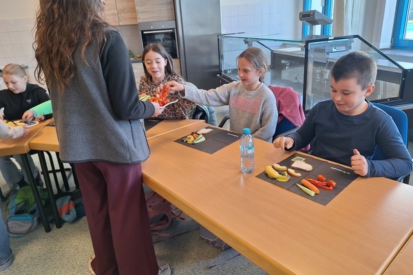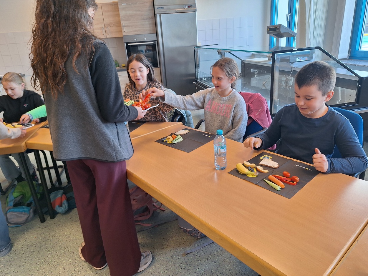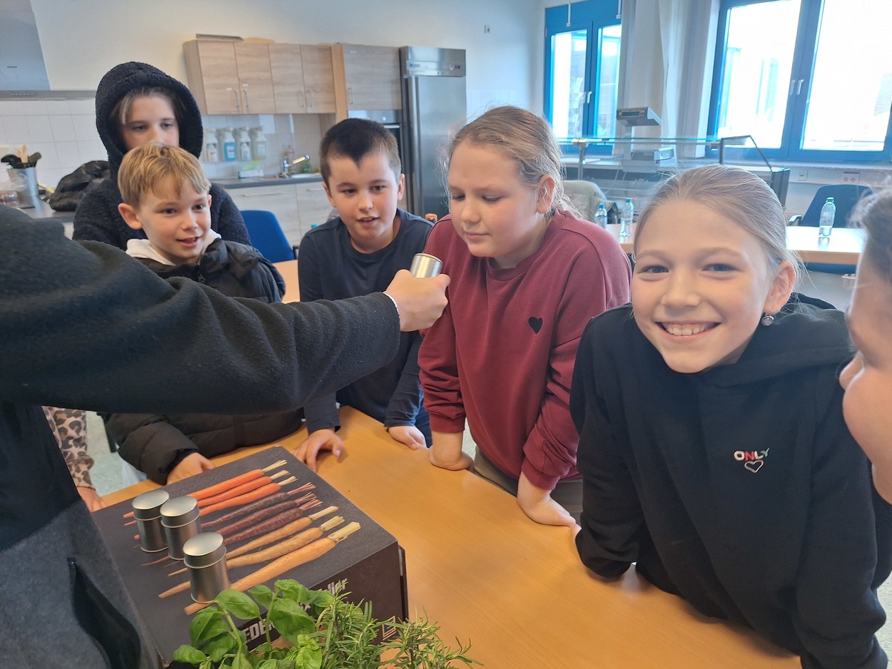 Im Markt angekommen, durften wir diesen erkunden, uns ins eiskalte Kühlhaus stellen, hinter die Kulissen der Pfand- und Abfallstation schauen und haben einen Geruchstest mit Gewürzen und Kräutern gemacht. Außerdem ging es viel um das Thema "Gesunde Ernährung" und wir bekamen ein leckeres und gesundes Frühstück mit buntem Gemüse, Vollkornbrot und Frischkäse. Obwohl wir gut in der Zeit waren, mussten wir am Schluss dann doch noch zum Bus spurten! Zum Glück hatten wir fixe Kinder, die den Bus mit Frau Banneitz anhielten. So kamen wir gut wieder nach Reute.