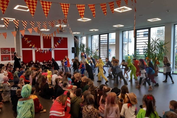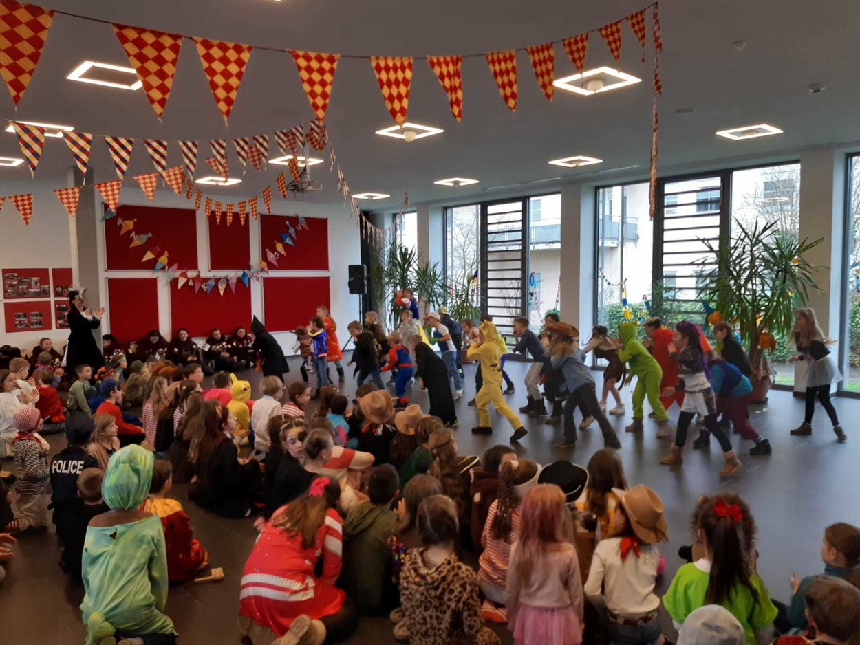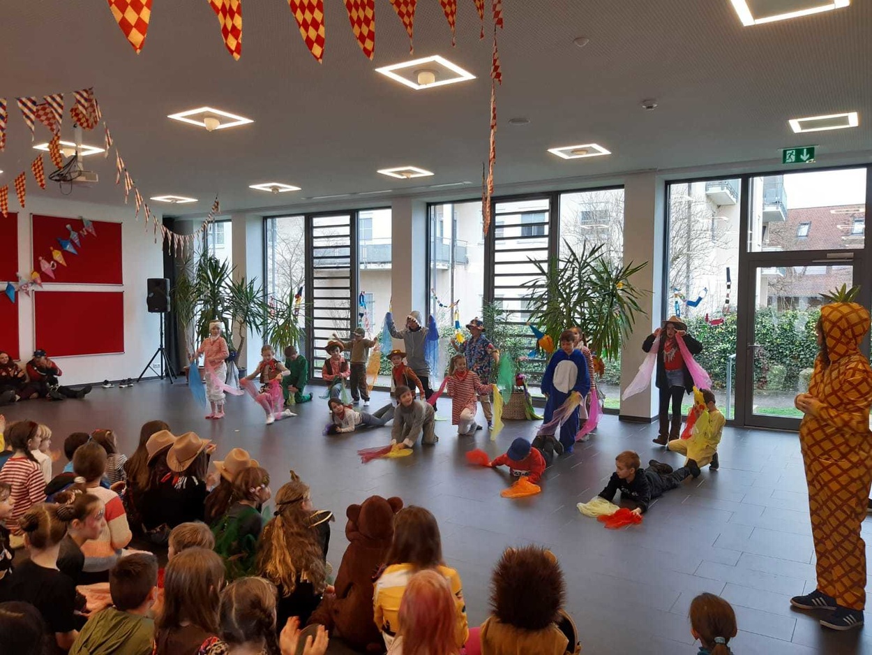 Angeführt von der Guggemusik der Riddemer Noderätscher befreiten die Schrättele und die MoorGalgenBrut alle Kinder aus dem Unterricht. Die Schulleitung um Herr Fakler und Frau Märtins wurde kurzerhand abgesetzt und so konnte das närrische Programm starten: Die Lehrkräfte hatten mit ihren Klassen ein stimmungsvolles und abwechslungsreiches Programm einstudiert, von Tänzen über Witze war alles mit dabei.