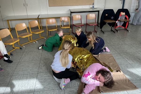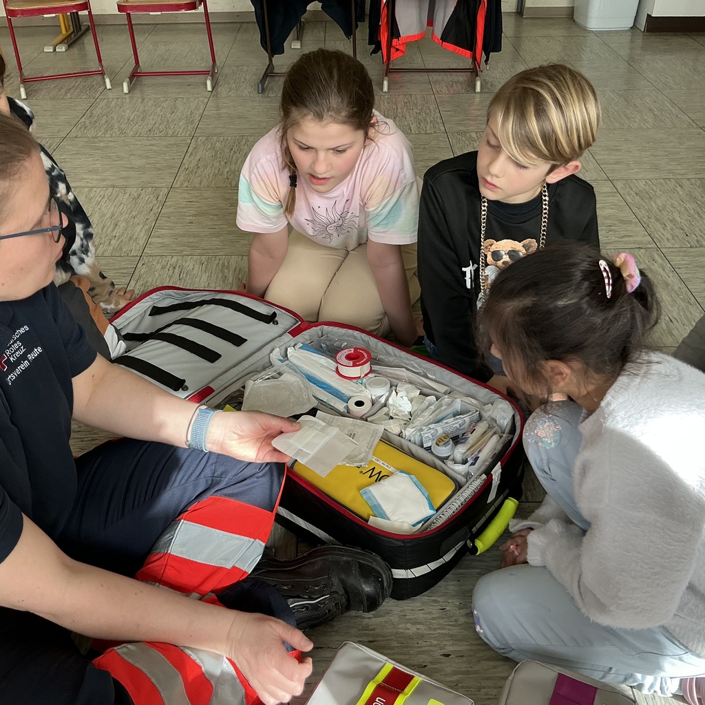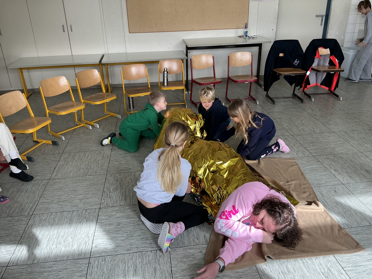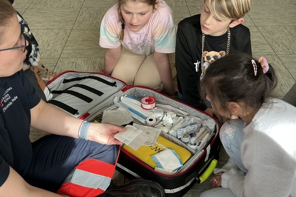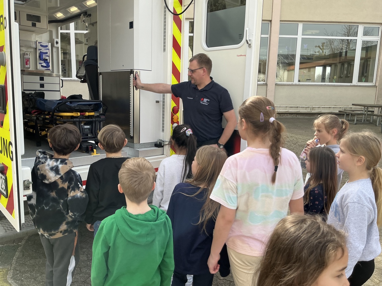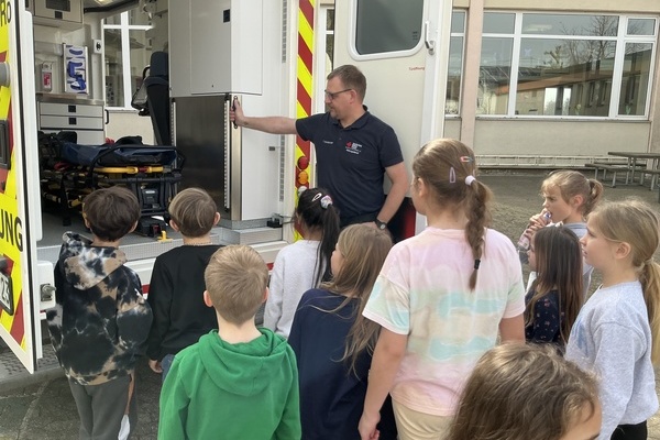 Im Laufe des Vormittages erfuhren die Kinder, wie sie sich in solchen Notfällen richtig verhalten und lernten wichtige Schritte der Erste-Hilfe praxisnah kennen. Gemeinsam wurde geübt Hilfe zu holen, einen Notruf richtig abzusetzen und jemanden in die stabile Seitenlage zu bringen. Zudem testeten alle den Einsatz einer Rettungsdecke. Als besonderes Highlight wartete zum Abschluss ein echter Krankenwagen auf dem Schulhof, der von allen angeschaut und inspiziert werden durfte.