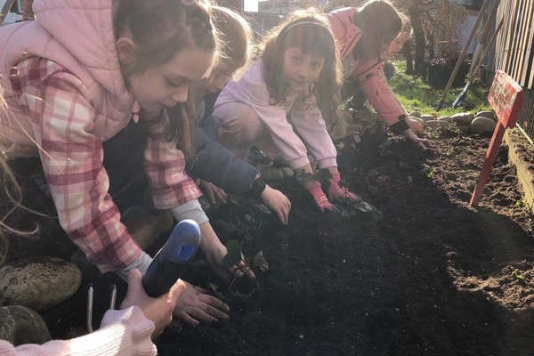 Klasse 1a nutzte das wunderbar frühlingshafte Wetter und legte ein Erdbeerbeet an.