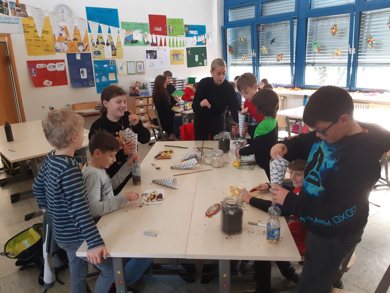 Zwei Mitarbeiter der Organisation FESA besuchten uns zum Thema Klimaschutz. Beim ersten Treffen unterhielten wir uns über Kohlenstoffdioxid und den Klimawandel. Für das nächste Treffen mussten wir einen Stock, eine leere 0,5 l Plastikflasche und Obst mitbringen. An diesem Termin durften wir an drei Stationen arbeiten. Wir bastelten Windräder, lernten, wie Solarzellen funktionieren und bauten eine Mini-Biogasanlage. Das machte sehr viel Spaß.