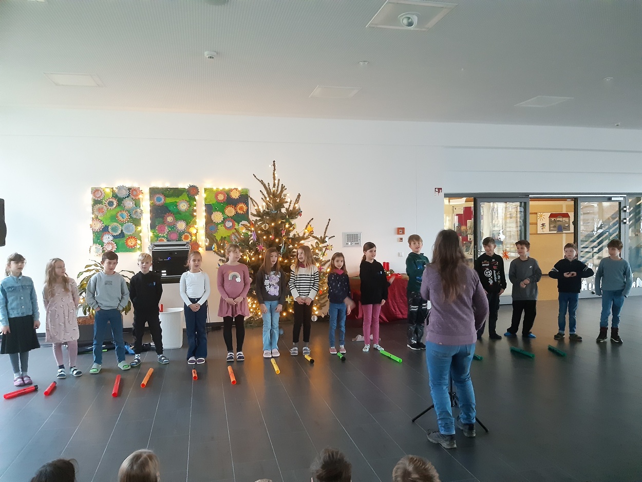 Immer montags nach den Adventssonntagen treffen wir uns in der weihnachtlich und winterlich geschmückten Aula, um uns gemeinsam auf den Advent einzustimmen. Umrahmt wird das Adventssingen von kleinen, aber feinen Programmpunkten der Kinder. Heute waren die dritten Klassen von Frau Noll und Frau Banneitz an der Reihe. Die Schülerinnen und Schüler hatten Lieder vorbereitet, die auf verschiedene Weise vorgetragen wurden, und auch ein Gedicht war mit dabei. Toll!
