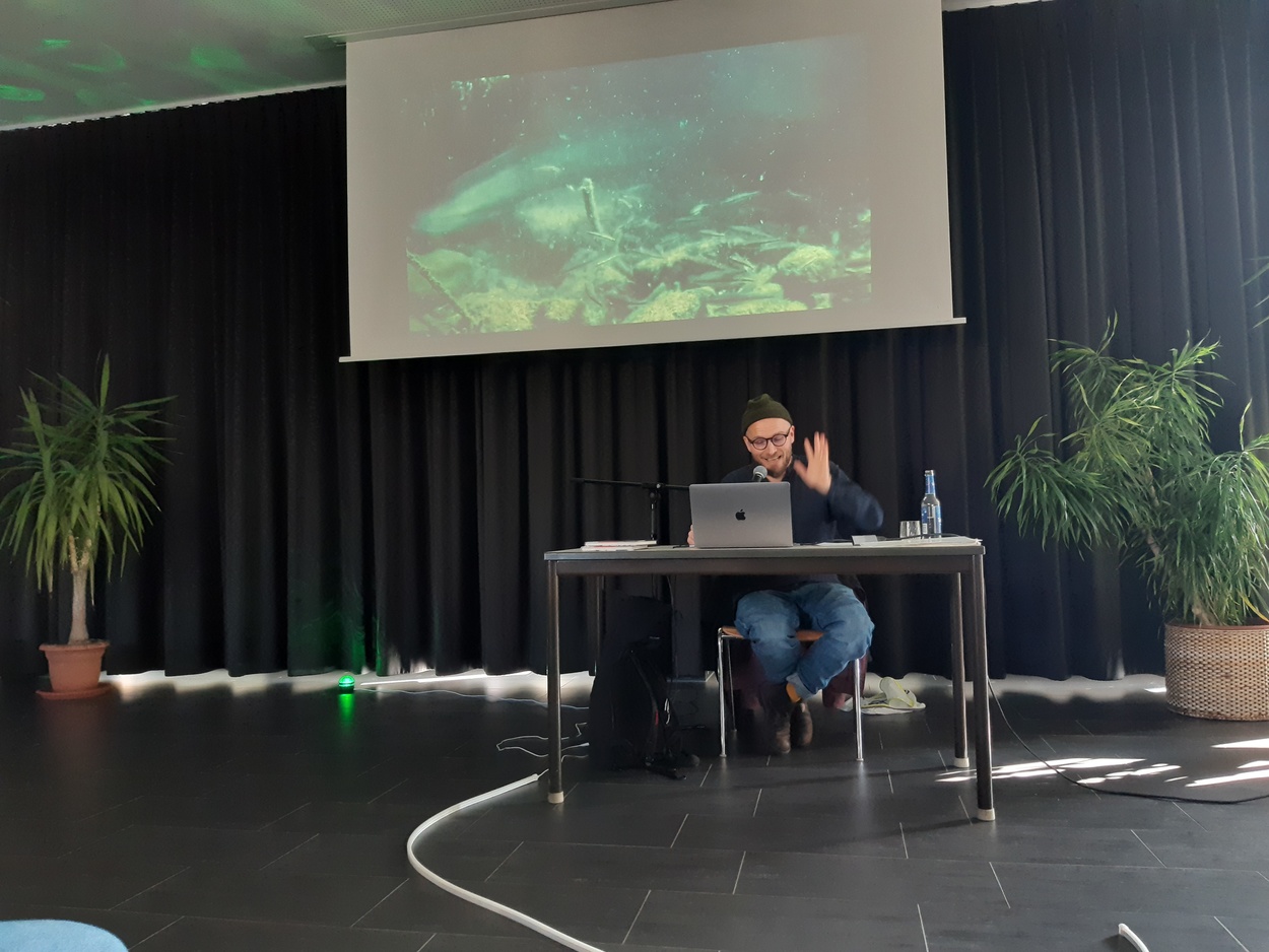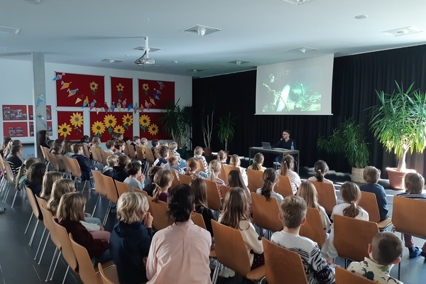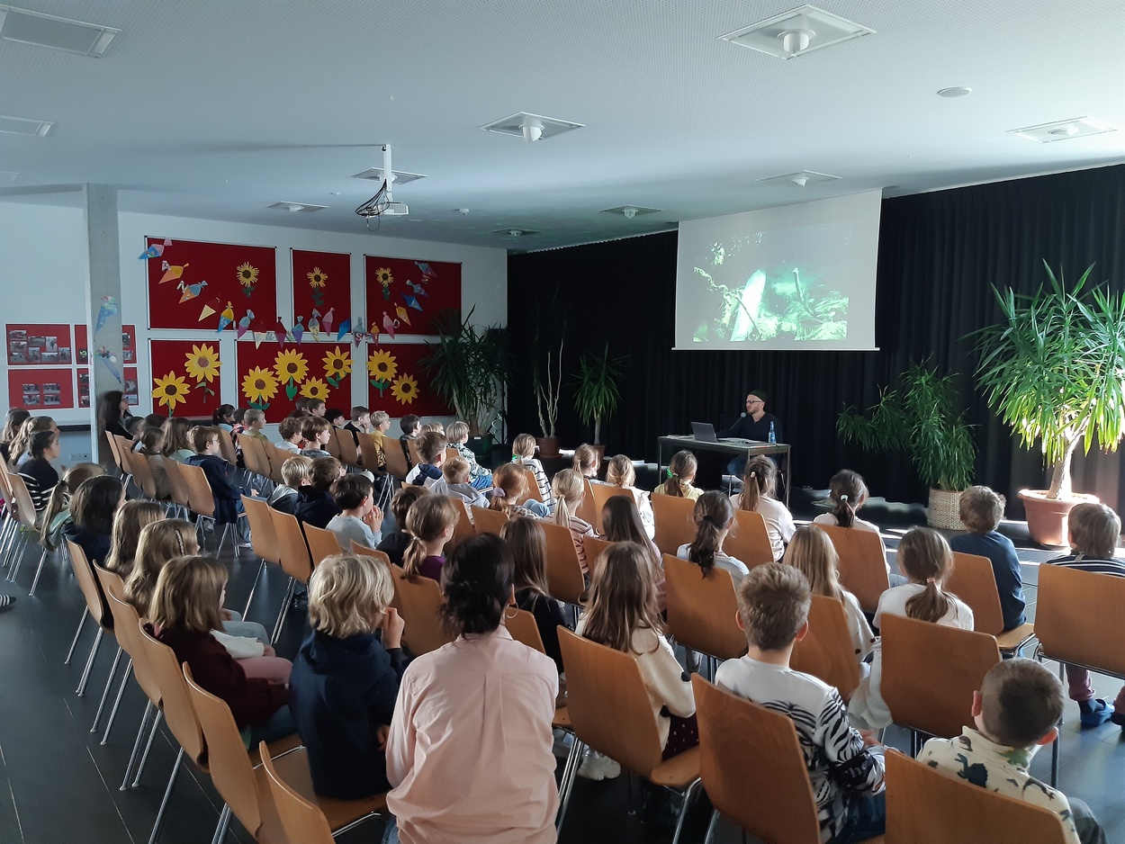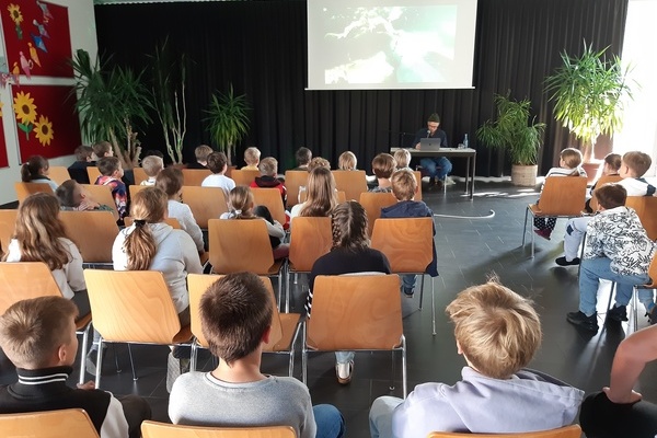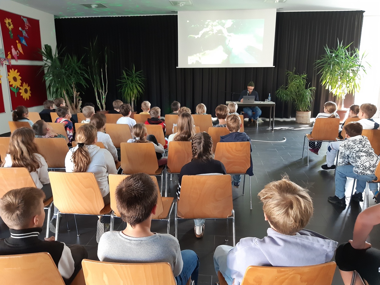 Auf ganz unterschiedliche Art und Weise begeisterte Finn-Ole Heinrich seine Zuhörer in der Aula. Für die Erst- und Zweitklässler las er zunächst aus "Frerk" und gewann die Kinder sofort mit seiner frischen, lebendigen und witzigen Erzählweise, bei der die Schüler immer wieder auch mitmachen konnten. Nach einer Pause ging es weiter mit der Lesung aus seinem neusten Werk "Aali". Dabei beeindruckte vor allem die perfekt getimte und stimmungsvolle Vortragsweise, die nahezu alle Sinne ansprach, weil das Zusammenspiel aus Licht-, Video- und Tontechnik die Zuhörer im wahrsten Sinne des Wortes in die Geschichte "eintauchen" ließen.