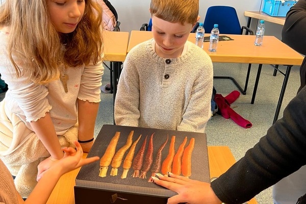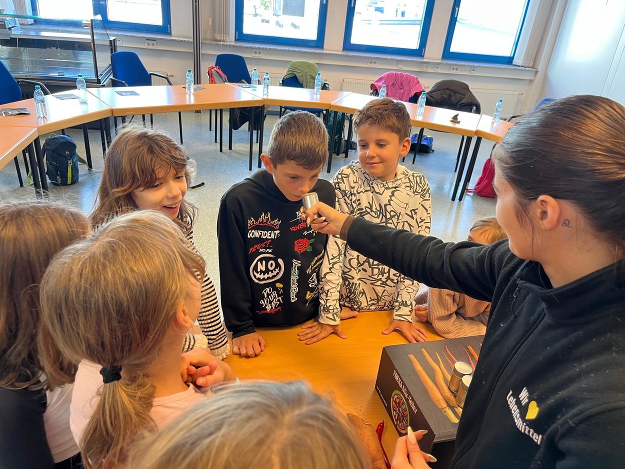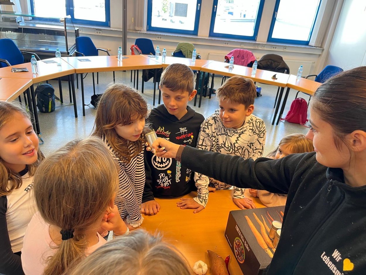 In Gundelfingen angekommen blieb noch Zeit für eine kurze Runde auf dem Spielplatz, dann ging es zum E-Center, bei dem wir gleich herzlich empfangen wurden. Nach einem spannenden Theorieteil zum Thema "Gesunde Ernährung" gab es ein super leckeres, abwechslungsreiches, gesundes Frühstück. Im Anschluss daran machten wir eine Führung durch den E-Center, bei der uns auch das Lager und die Papierpresse gezeigt wurden, außerdem konnten wir an Gewürzen riechen und raten, was es für welche waren sowie Kräuter probieren und in einer Fühlkiste Obst und Gemüse erfühlen.