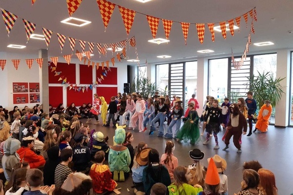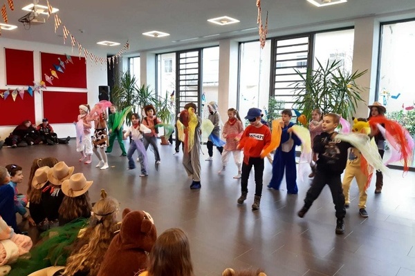 Angeführt von der Guggemusik der Riddemer Noderätscher befreiten die Schrättele und die MoorGalgenBrut alle Kinder aus dem Unterricht. Die Schulleitung um Herr Fakler und Frau Märtins wurde kurzerhand abgesetzt und so konnte das närrische Programm starten: Die Lehrkräfte hatten mit ihren Klassen ein stimmungsvolles und abwechslungsreiches Programm einstudiert, von Tänzen über Witze war alles mit dabei.