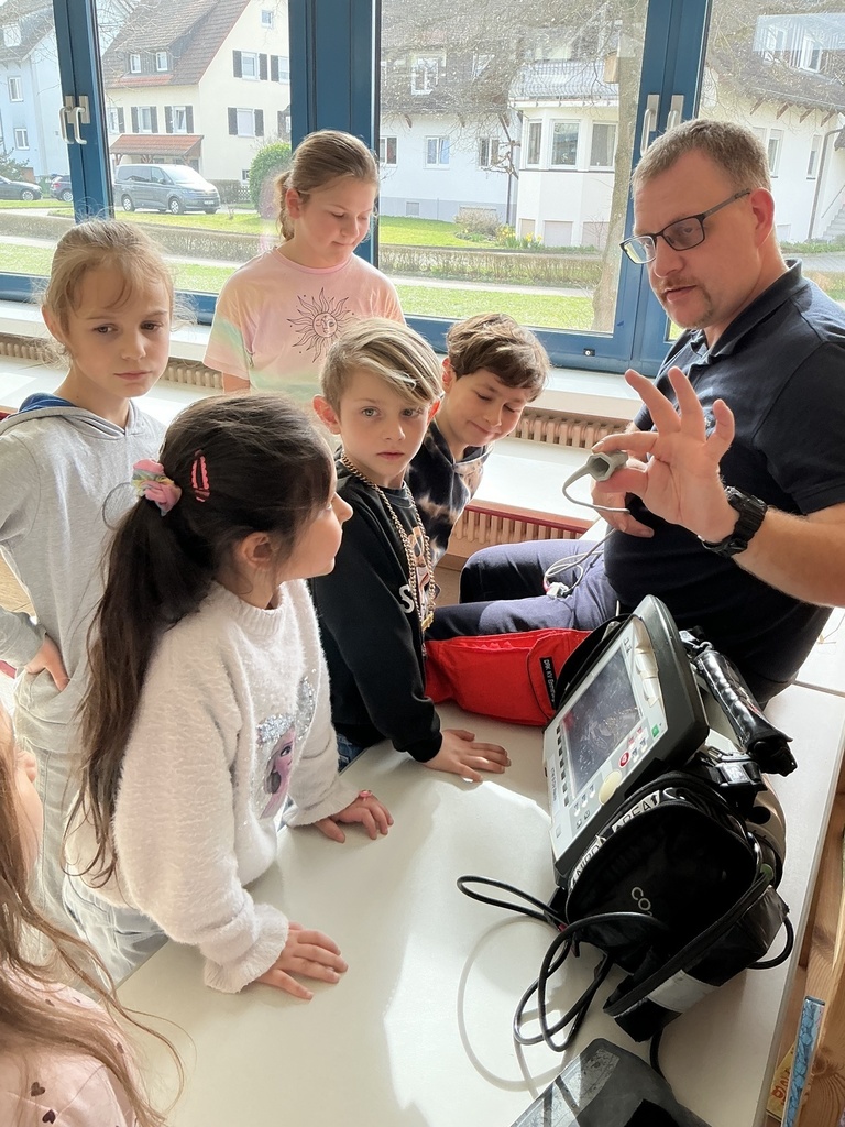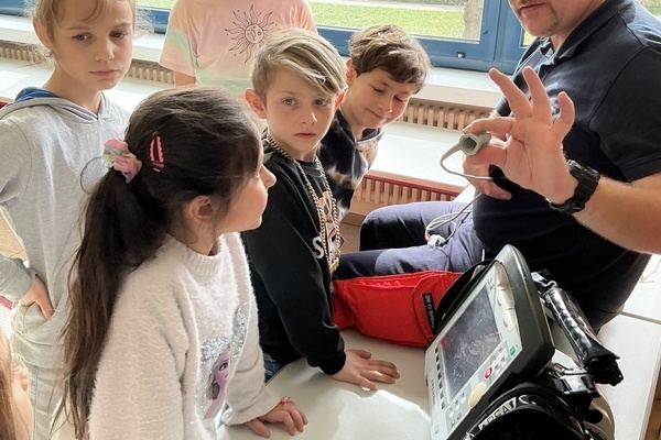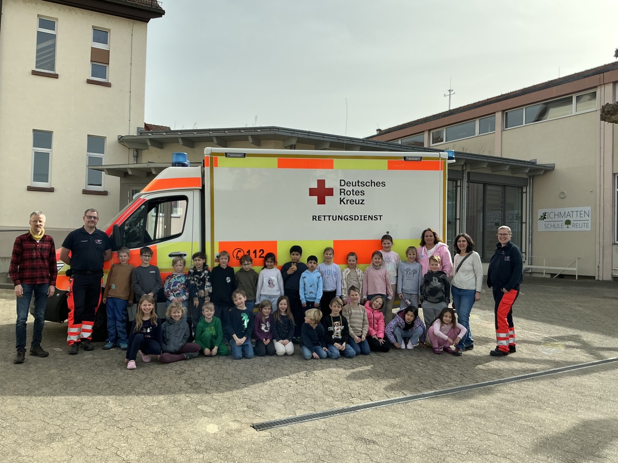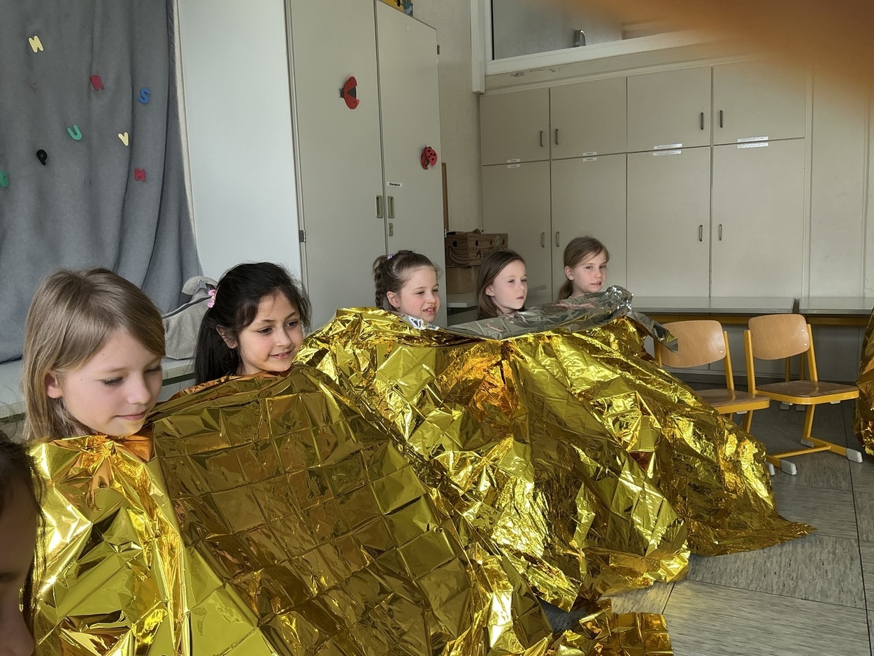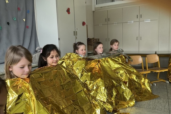 Im Laufe des Vormittages erfuhren die Kinder, wie sie sich in solchen Notfällen richtig verhalten und lernten wichtige Schritte der Erste-Hilfe praxisnah kennen. Gemeinsam wurde geübt Hilfe zu holen, einen Notruf richtig abzusetzen und jemanden in die stabile Seitenlage zu bringen. Zudem testeten alle den Einsatz einer Rettungsdecke. Als besonderes Highlight wartete zum Abschluss ein echter Krankenwagen auf dem Schulhof, der von allen angeschaut und inspiziert werden durfte.