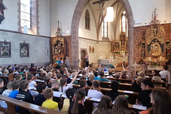 Der Abschlussgottesdienst wurde von unsereren Religionslehrerinnen Frau Gairing und Frau Buderer geleitet und von Herr Hey und wiederum Frau Buderer mit Geige und Gitarre begleitet. In den Liedern, Fürbitten und Texten war der Rückblick auf das vergangene Schuljahr ein wichtiges Thema und so stellten die Kinder so manches persönliche Highlight in den Vordergrund. Die Dankbarkeit dafür und der Blick voraus in Richtung Sommerferien und den Schulstart in einer höheren Klasse oder sogar der weiterführenden Schule spielten ebenso eine große Rolle wie die damit verbundenen Wünsche für die Schulkinder. Diese wiederum zeigten eindrucksvoll, wie toll sie als Gemeinschaft singen können.